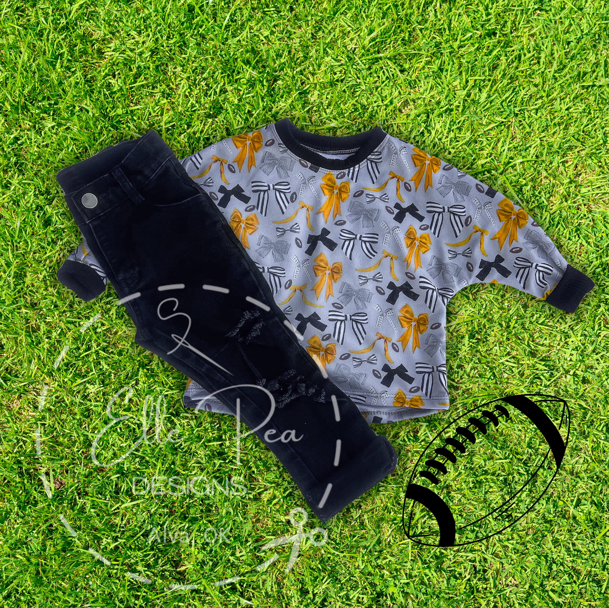 Get your little one ready for Friday Night Lights with our OOAK Laurel Slouchy Tee! This unique and playful top features black and gold bows, perfect for showing off your team spirit. With a slouchy fit and made for 9-12 months, this tee is truly one of a kind. Touchdown! This Tee is made with Double Brushed Polyester.