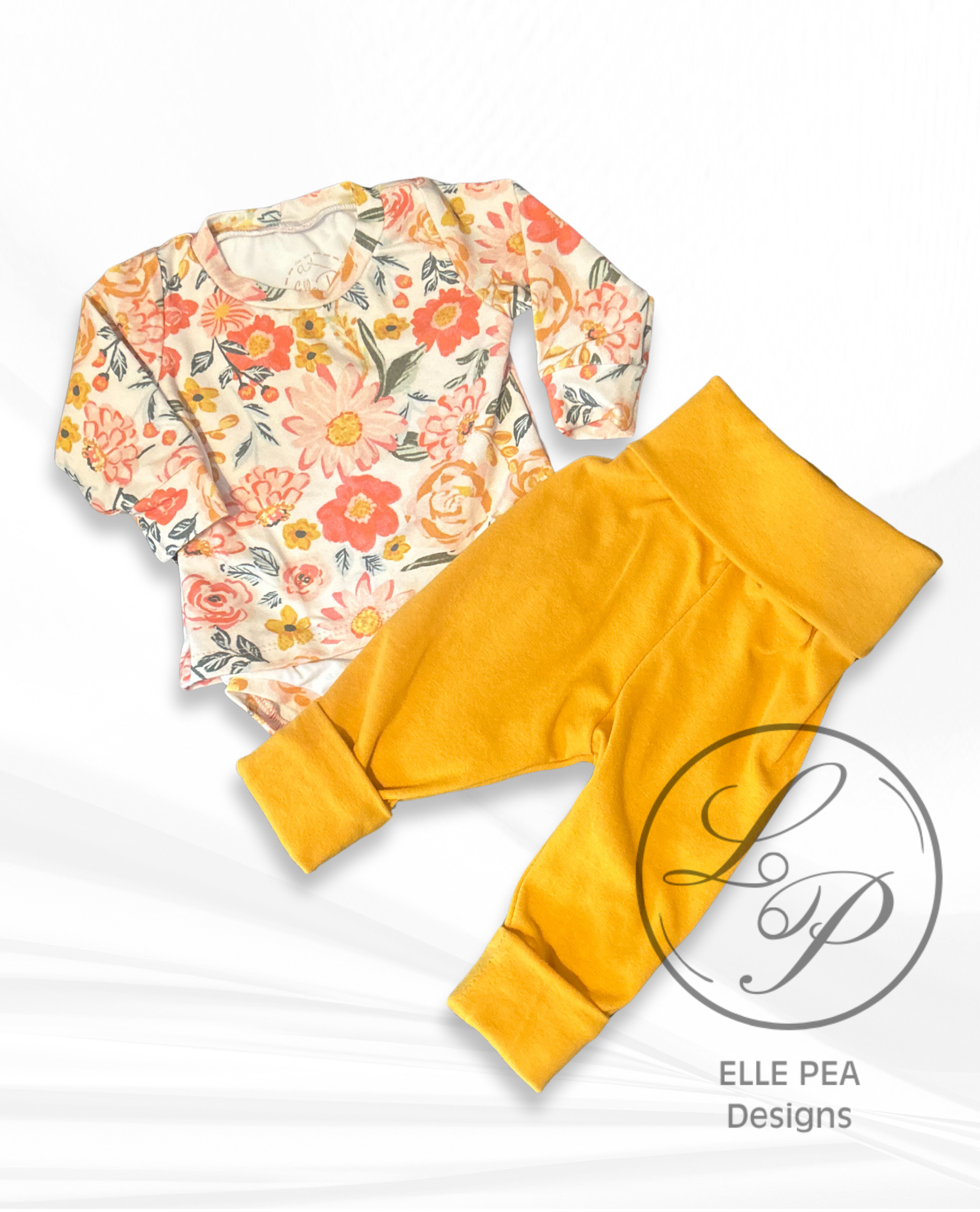 Floral shirt with attached bodysuit with snaps and Mustard lounge pants - 3-6M